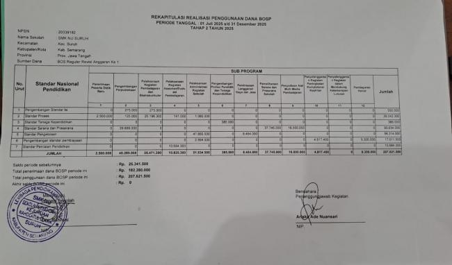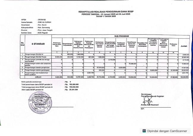 Berikut tersaji detail laporan BOSP Tahap I Periode 1 Januari 2025 sampai 30 Juni 2025 SMK NU...